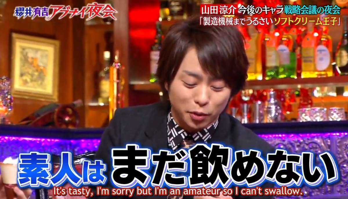 The new subbed video release on arashi_on... what shop curtain? There's no shop curtain mentioned anywhere in the talk? And then this photo making it's rounds on twitter? LOLOLOLOL! Just hilarious. First off it's a wrong insertion of a pronoun. Secondly... there was no mention of 'difficult' or 'swallow', and there's no amateur either.